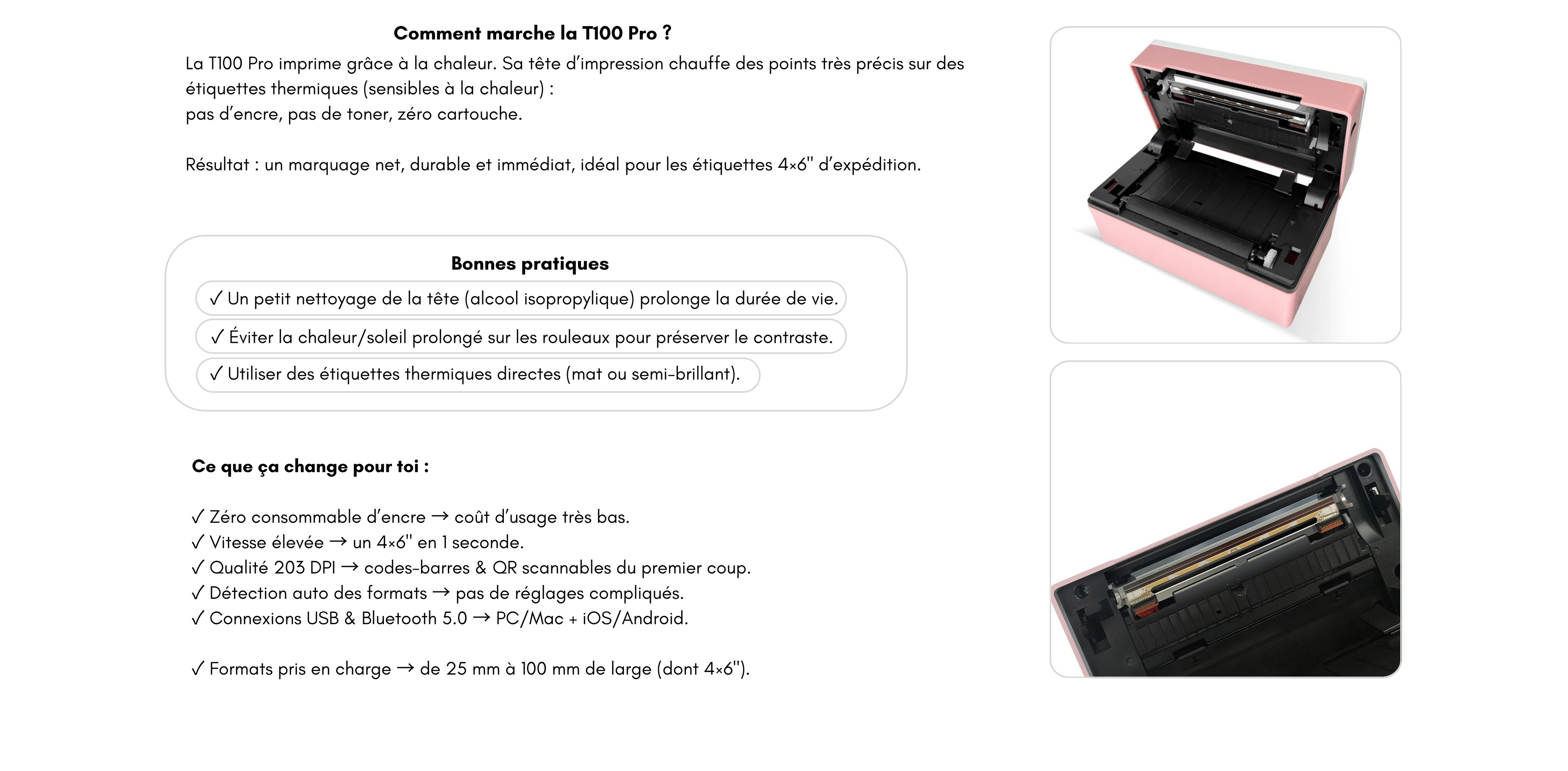 La Labelix T100 Pro imprime vos étiquettes sans encre grâce à la technologie thermique directe.